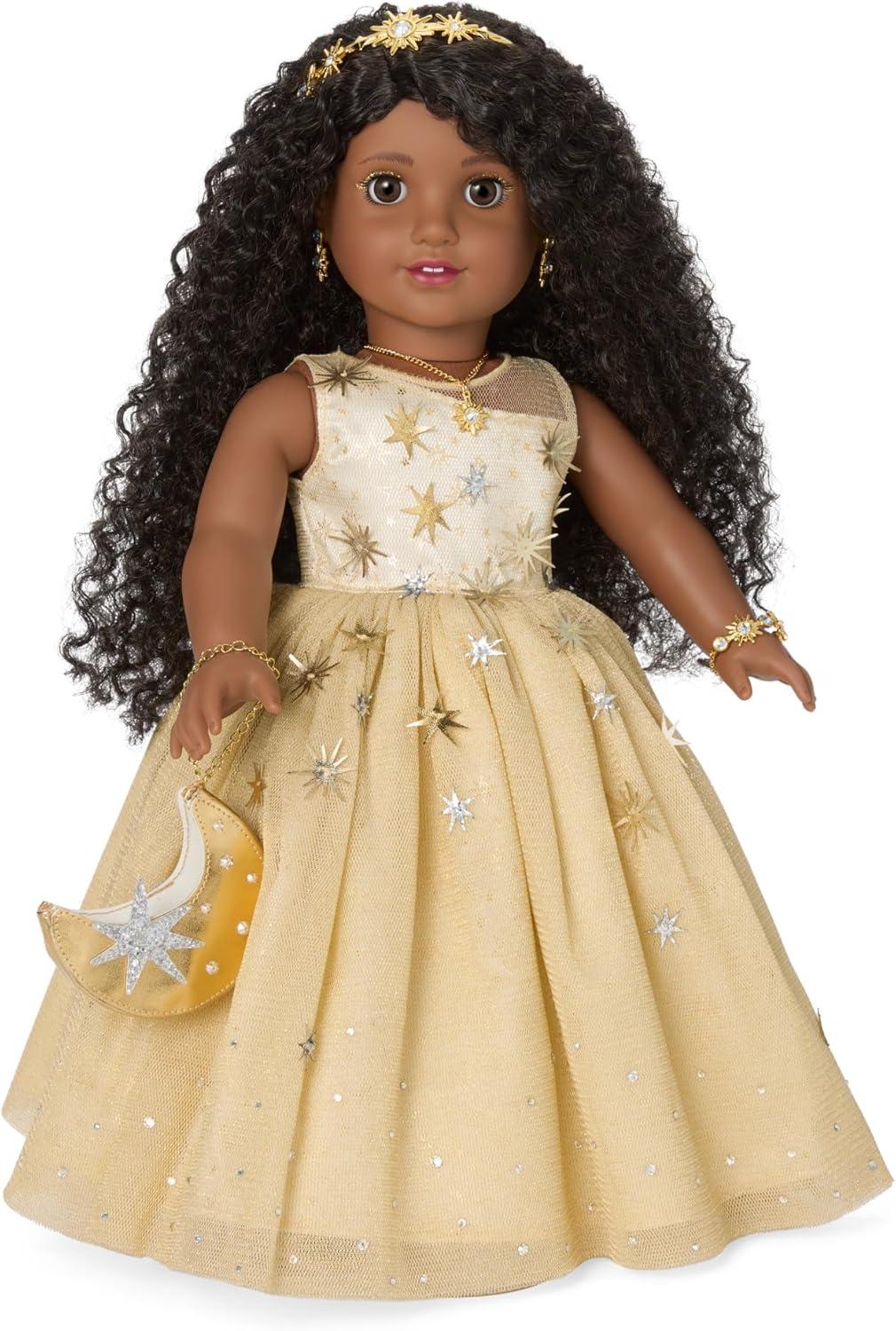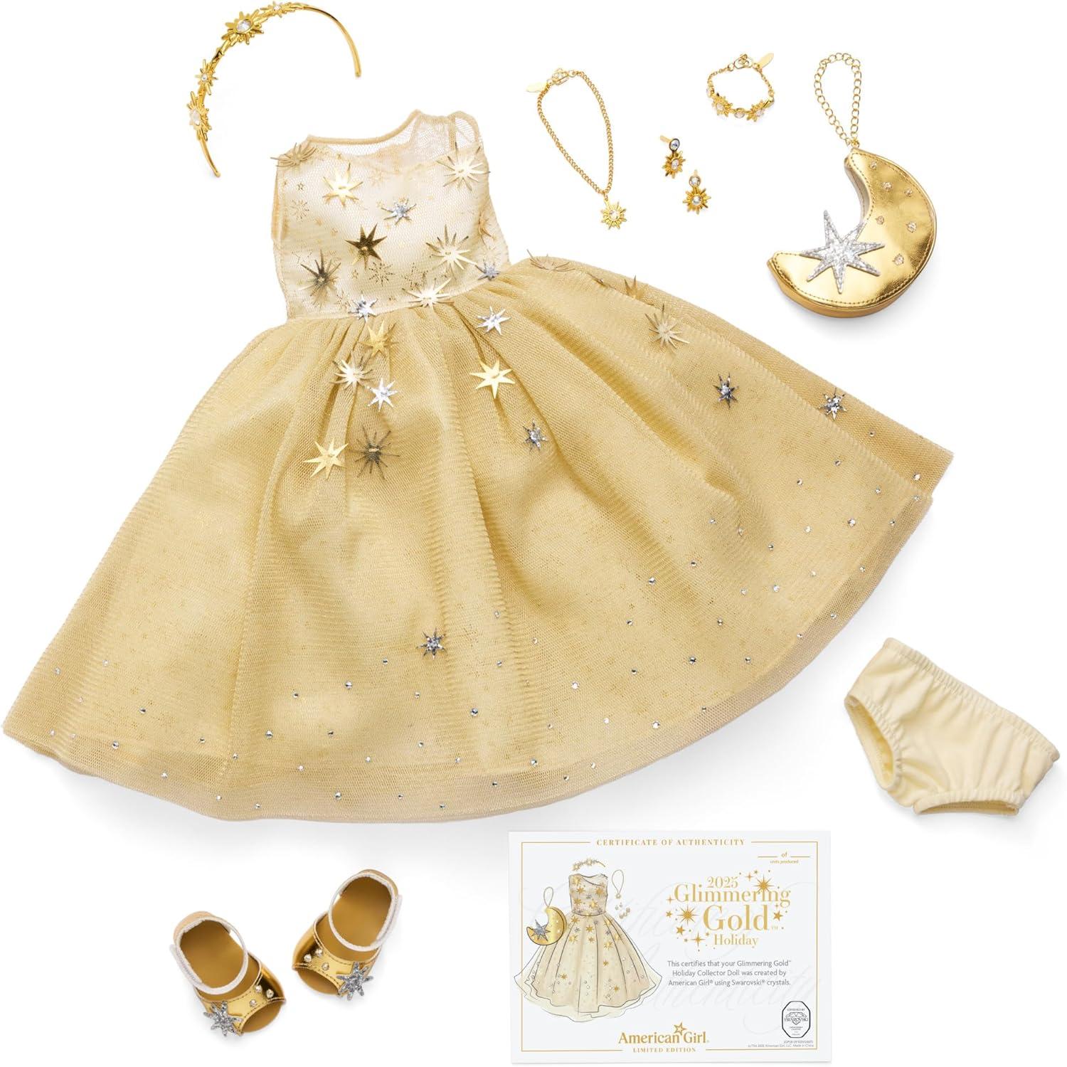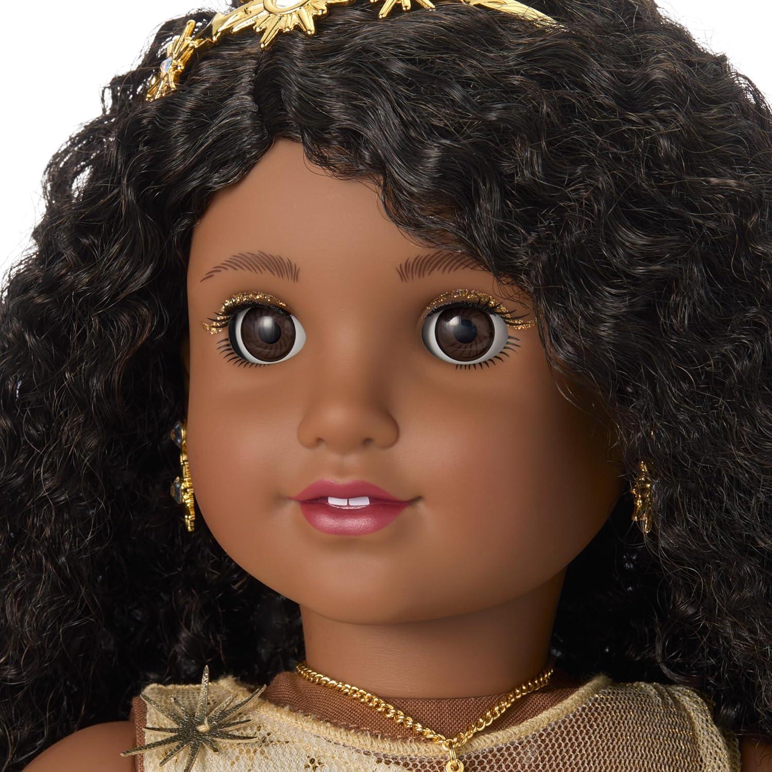 A gleaming jewel in any light, this limited-edition American Girl 2025 holiday collector doll sparkles with celestial wonder. Her golden floor-length gown is draped in cascading stars and glitters with more than 100 Crystal Moonlight Swarovski crystals, mirroring the depth and glow of a night sky. This beautiful American Girl Collector Series doll features brown eyes and long curly black hair. No more than 11,000 American Girl 2025 Glimmering Gold Holiday Collector Dolls have been created worldwide.