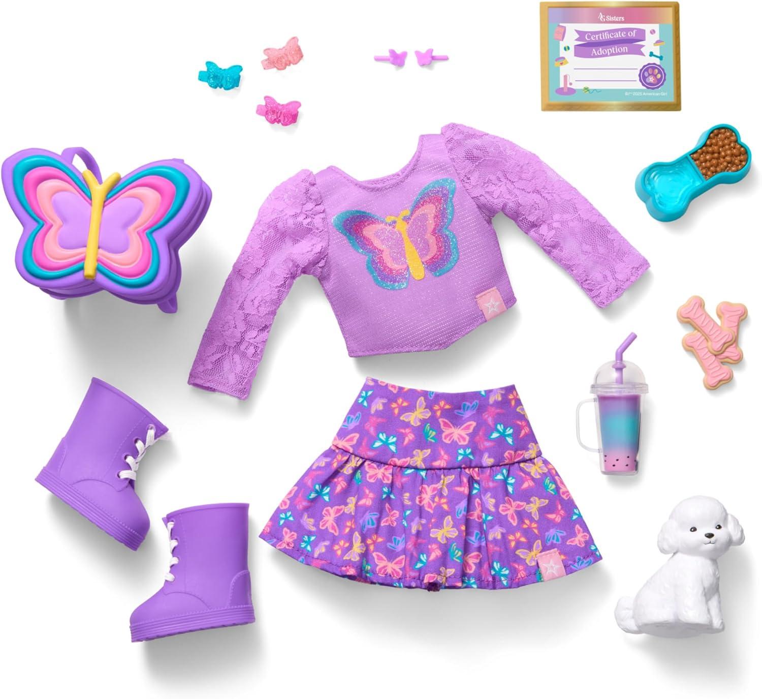 A purple glitter-knit top with a butterfly graphic, lace sleeves, and a flouncy purple skirt with a multicolored butterfly print