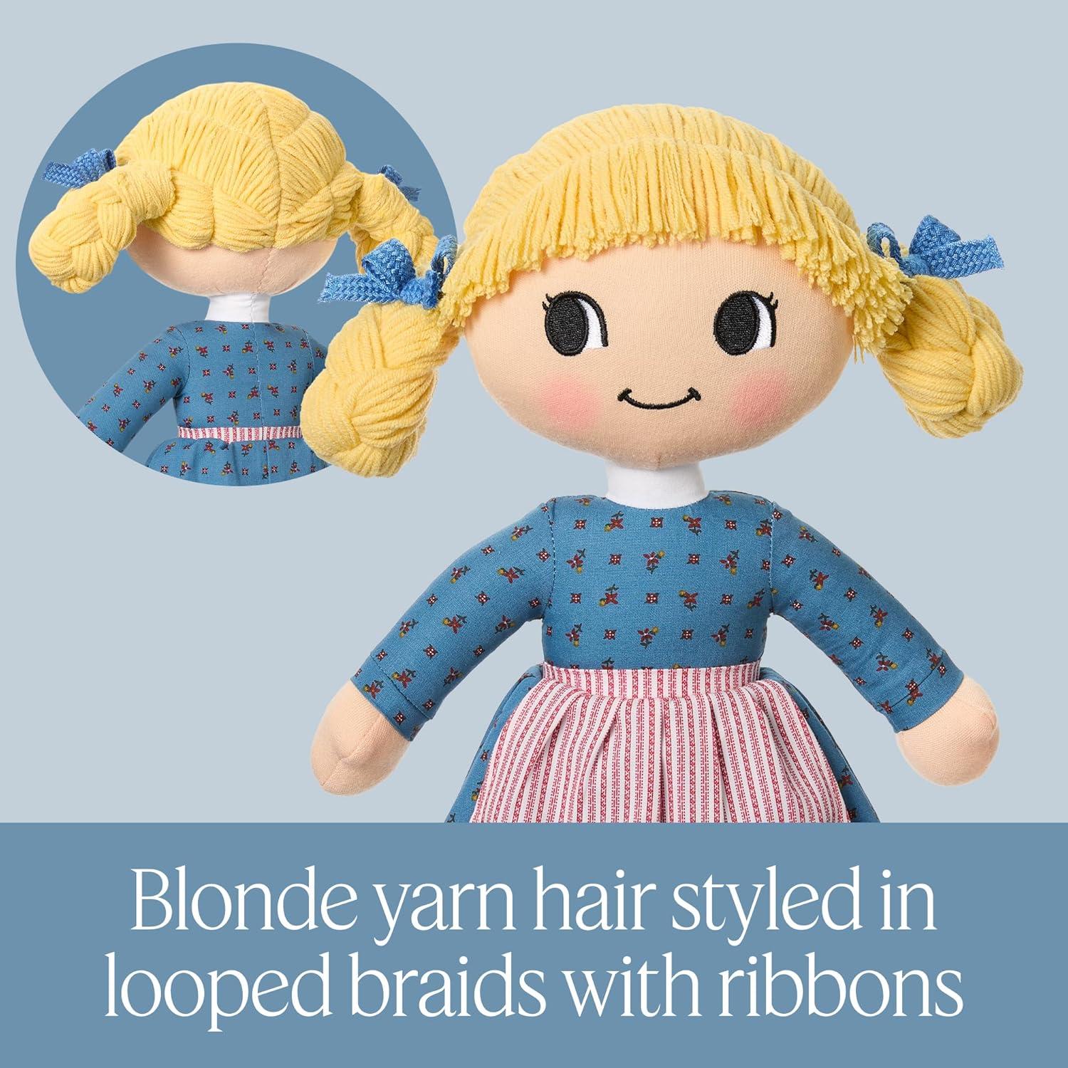 A 13.5″ My First Kirsten knit plush doll with blonde yarn hair styled in looped braids with blue ribbons, rosy-pink cheeks, and embroidered eyes and smile. Her sewn-on outfit is inspired by Kirsten’s signature look: a blue calico-print dress with tiny red flowers, a red-and-white striped apron, white pantalettes with lace trim, striped knit socks, and brown faux-leather boots with laces.