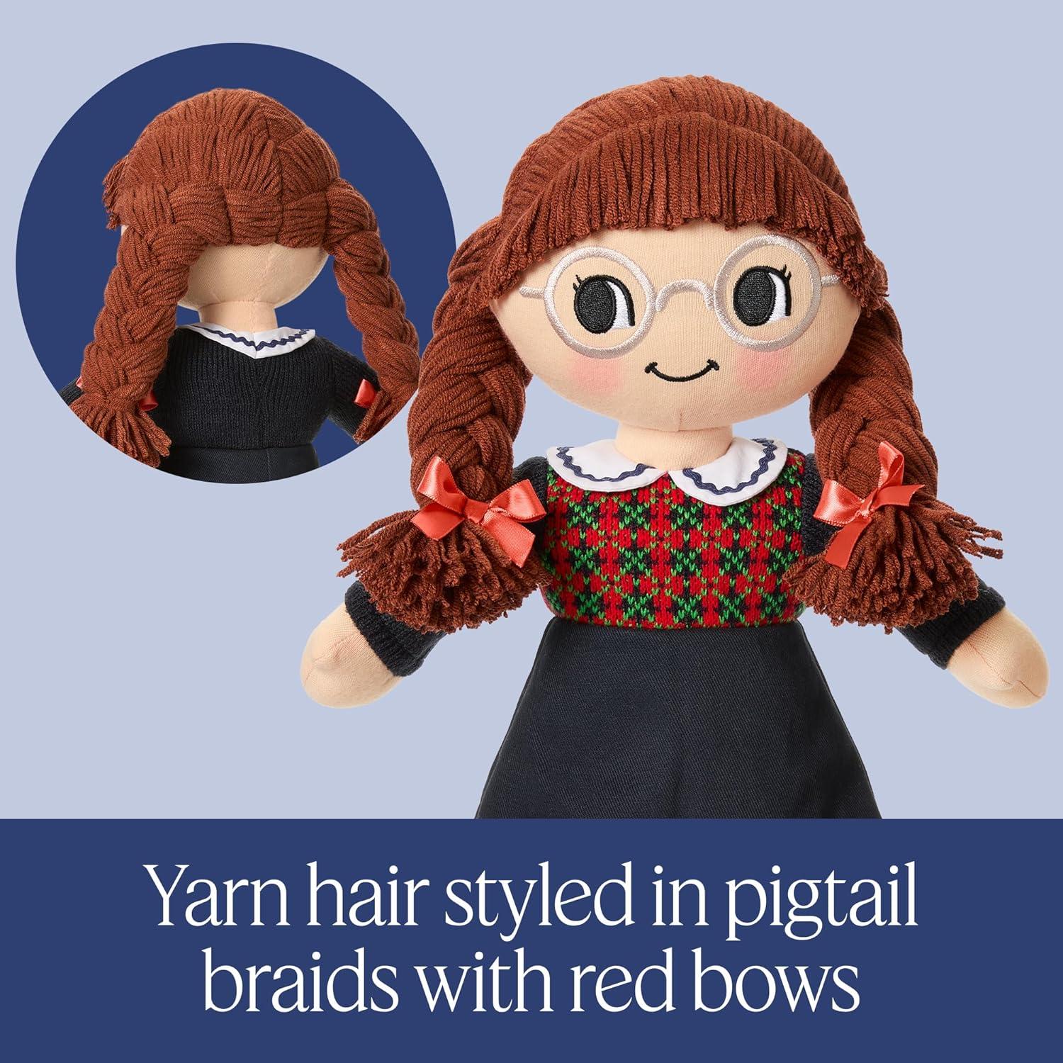 A 13.5″ My First Kirsten knit plush doll with blonde yarn hair styled in looped braids with blue ribbons, rosy-pink cheeks, and embroidered eyes and smile. Her sewn-on outfit is inspired by Kirsten’s signature look: a blue calico-print dress with tiny red flowers, a red-and-white striped apron, white pantalettes with lace trim, striped knit socks, and brown faux-leather boots with laces.