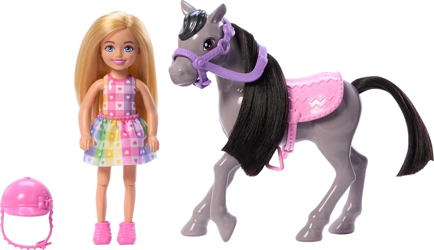 Barbie Chelsea Doll & Toy Horse Set, Includes Helmet Accessory & Saddle, Small Doll Bends at Knees to “Ride” Gray Pony
