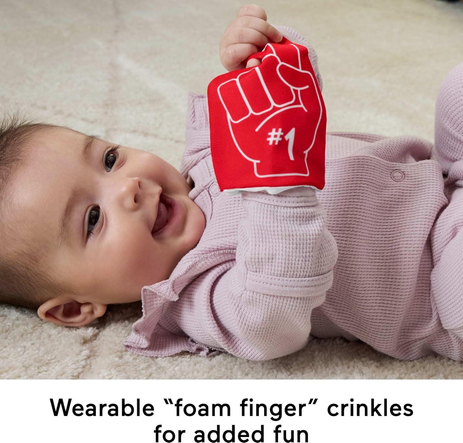 Includes crinkle cooler, plush football, crinkle “foam finger,” roller hot dog, teether snack chip, and a mirror styled like a goal post with a suction button