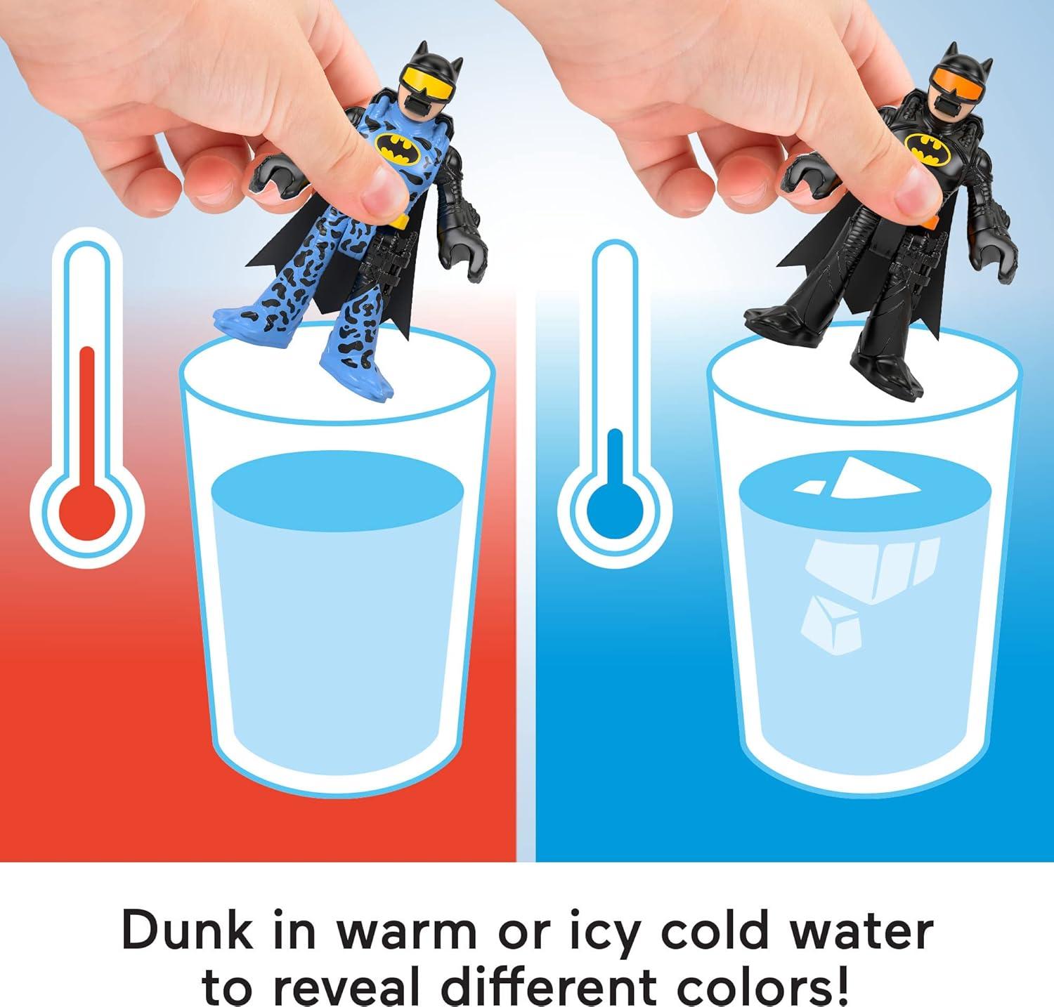 Action-packed Super Hero versus Super-Villain adventures get an exciting new twist with this color-changing Imaginext DC Super Friends Color Changers figure set from Fisher-Price. Fill the included cannister with either warm or icy cold water and drop Batman and Harley Quinn inside to see the figures change color! Kids can collect additional Imaginext DC Super Friends Color Changers figure sets for more exciting pretend play. (Each sold separately and subject to availability.) Colors and decorations may vary.