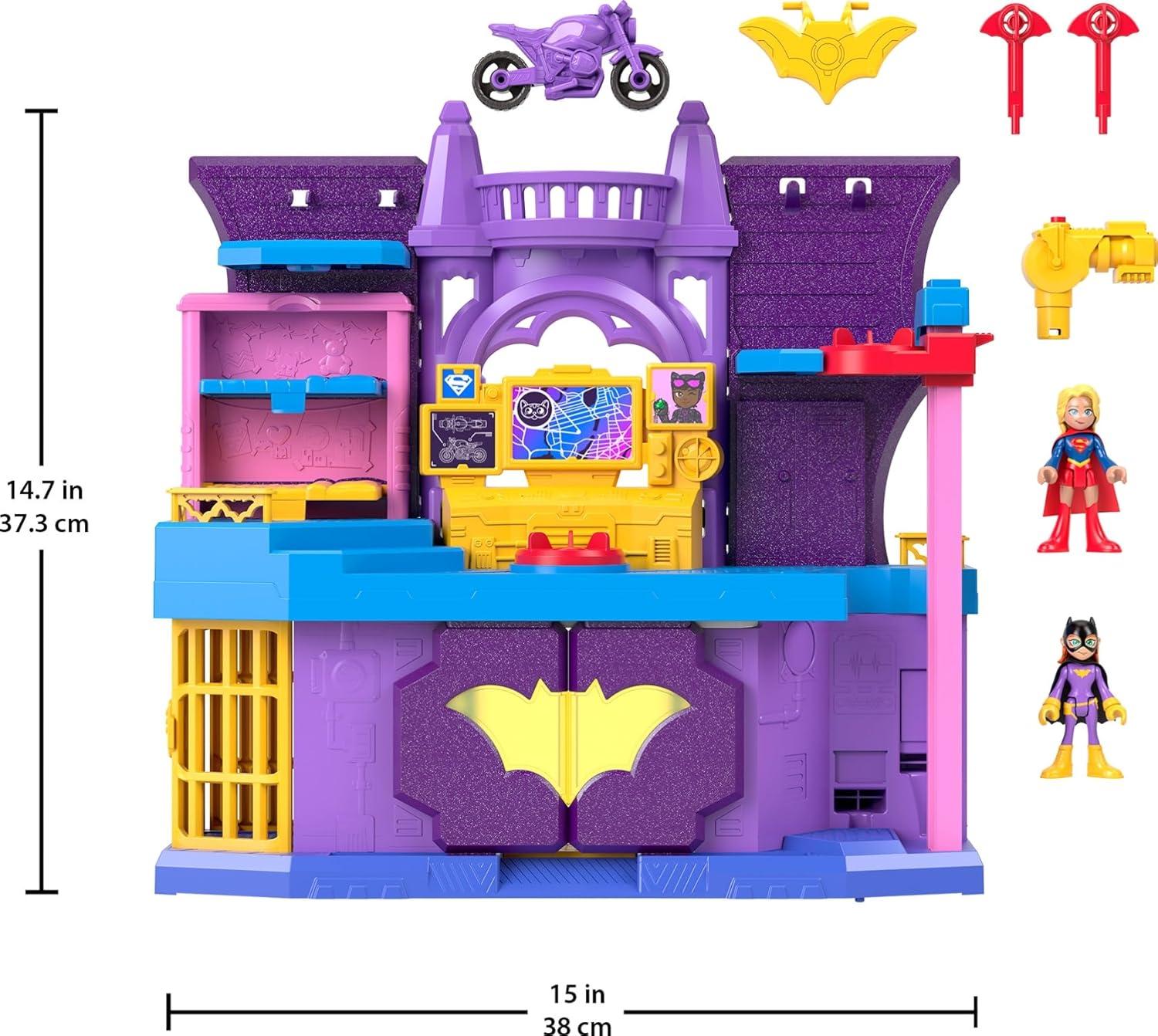 Kids can act out fun DC Super Friends stories with this multi-level, action-Packed Imaginext playset featuring Batgirl and Supergirl
