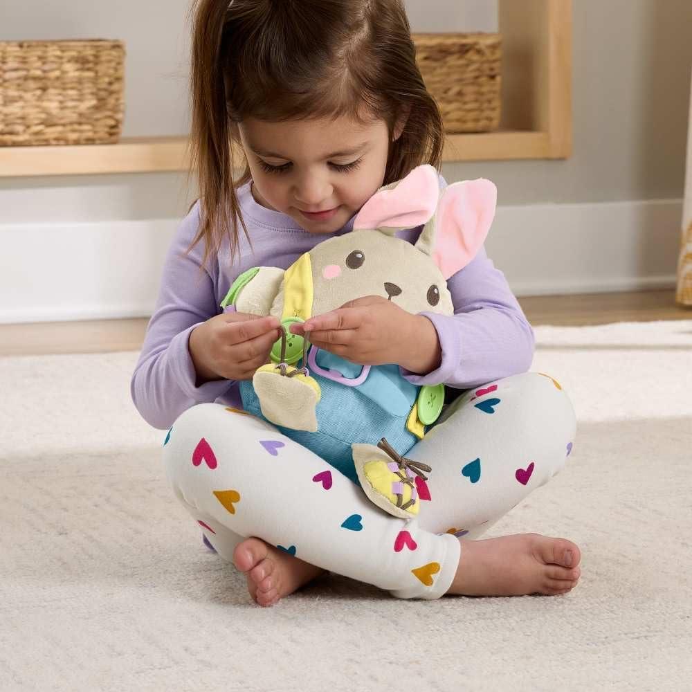Bunny plush educational toy for toddlers with fun, hands-on activities to help kids learn to how to dress