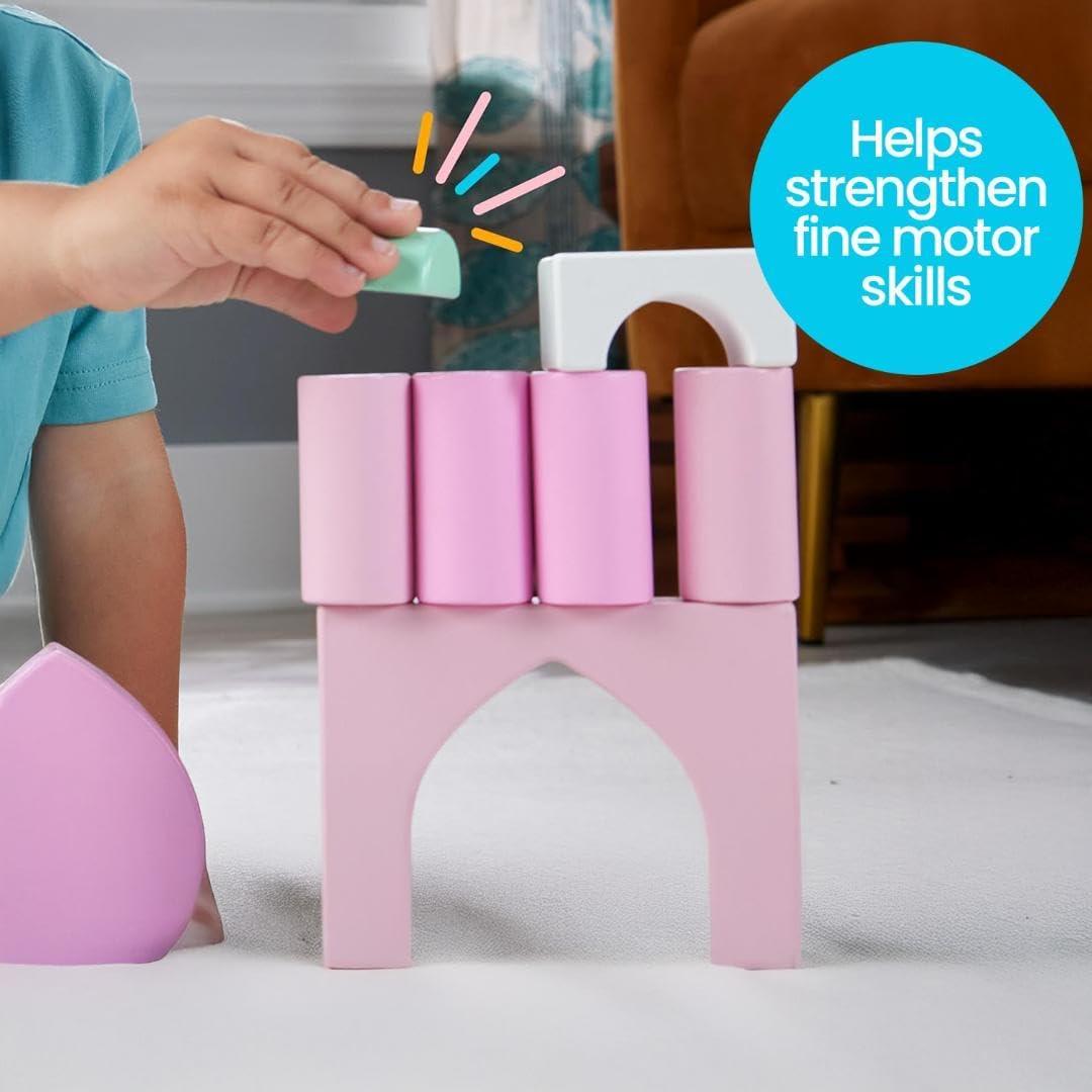 Toddlers and preschool kids will love building a castle, a house or anything they can imagine with the Wooden Castle Block Set from Fisher-Price. This stacking toy includes 27 pastel-colored wooden blocks that come with a handy playboard to help keep things organized. Made with wood from Forest Stewardship Council-certified sources (FSC-N004566) and decorated with non-toxic, water-based paints, these blocks encourage your child’s creativity and help to build up their fine motor skills! Colors and decorations may vary.