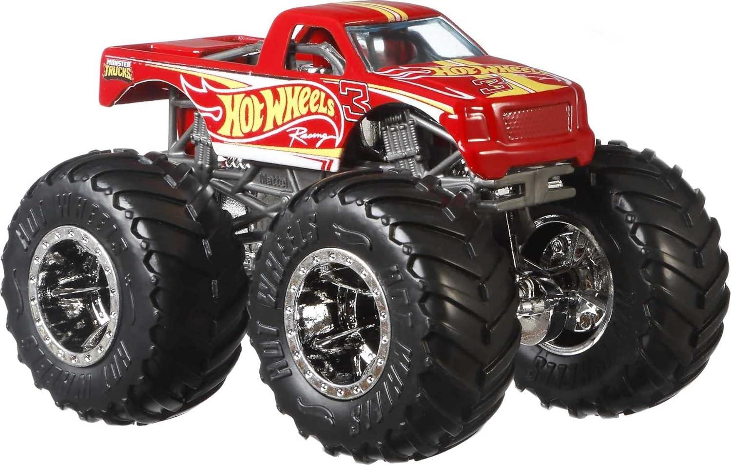 The Hot Wheels Monster Trucks Demolition Doubles pack doubles the action with two Monster Trucks ready to square off in head-to-head battles Each of the two die-cast vehicles is 1:64 scale and features the giant wheels and big personalities kids 3 years old and up love they'll want to collect them all. Each set sold separately, subject to availability. Colors and decorations may vary.
