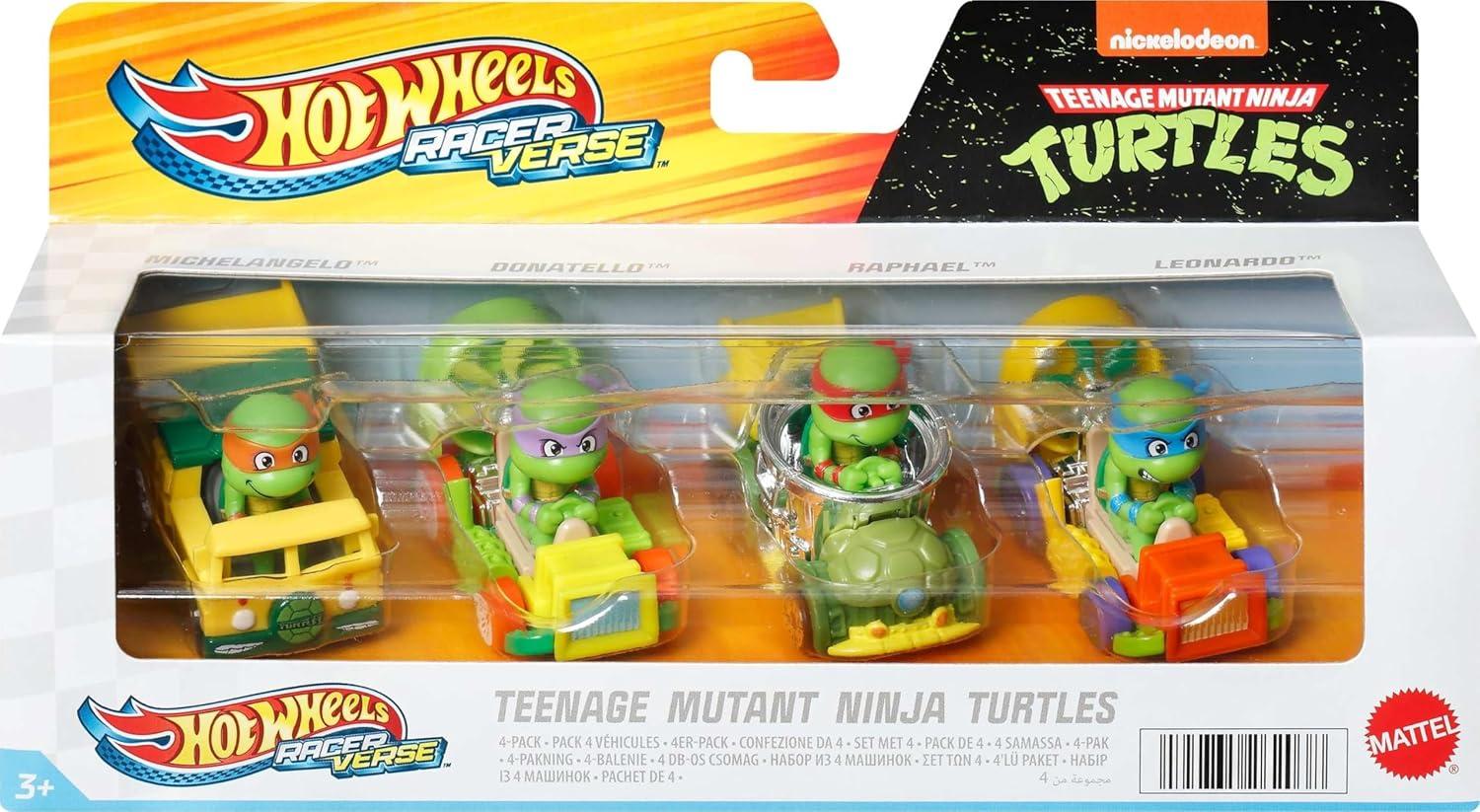 Hot Wheels RacerVerse, Set of 4 Die-Cars 1:64 Scale Toy Cars Optimized for Driving on Tracks with Pop Culture Characters as Drivers(Teenage Mutant Ninja Turtles)