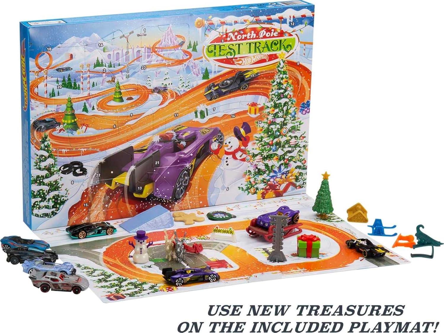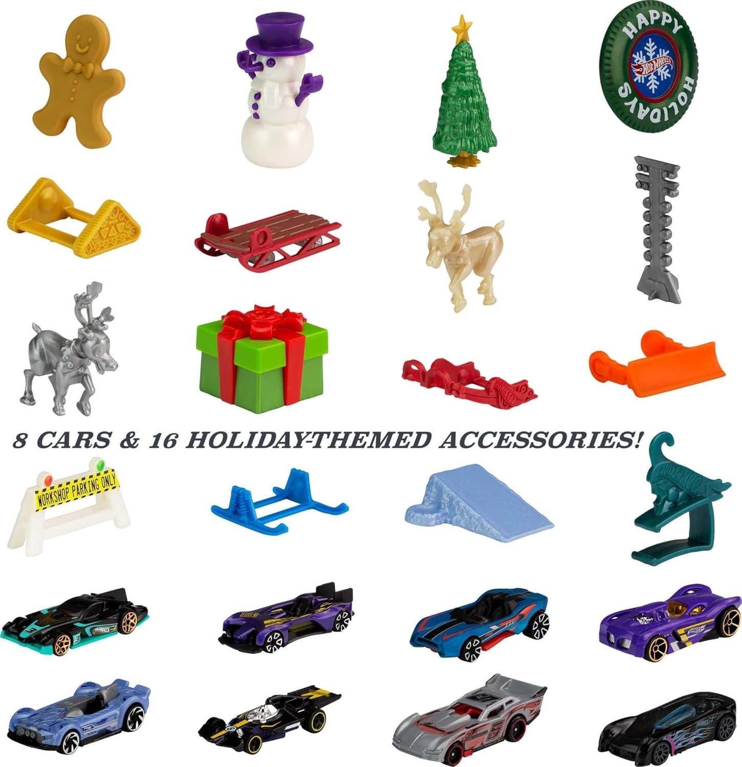 Hot Wheels Toy Cars, 2022 Advent Calendar with 8 1:64 Scale Vehicles, 16 Holiday-Themed Accessories & Playmat(Version 3)