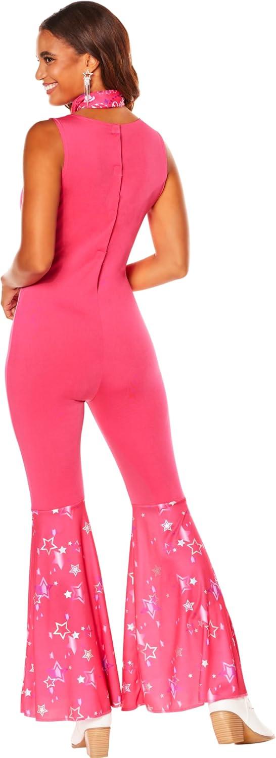 You'll be ready for the ranch in this officially licensed adult Barbie cowgirl costume! This adult Barbie cowgirl costume includes a pink sleeveless jumpsuit with flared pants and a matching bandana. Look and feel like a classic Barbie doll in this cheery pink cowgirl costume.