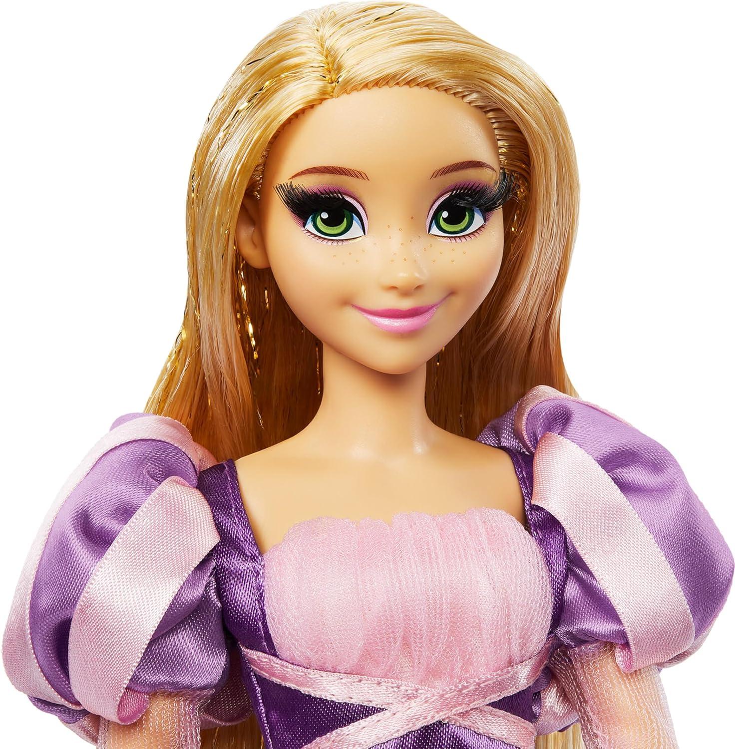 Recalling her hair’s magical healing powers, Rapunzel doll’s long locks are accented with gold shimmer shine.