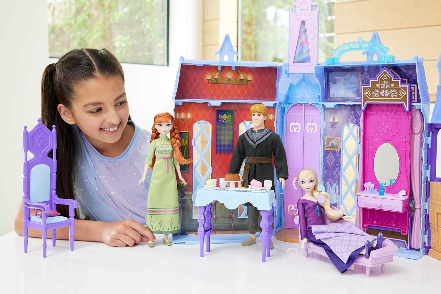 Celebrate the world of Disney's Frozen 2 with the Ultimate Arendelle Adventure gift set! This set includes a portable castle playset that's over 2 feet tall and filled with true-to-movie details, three dolls (Anna, Elsa and Kristoff), an Olaf figure and an extra fashion for both Anna and Elsa. Inside the castle doll house, kids will discover 4 play areas and surprises like a flip-down bed and rotating fireplace. More than 25 accessories, including furniture and food play pieces, make it easy to re-create scenes from the movie. Playset also folds for easy storage and travel-friendly play. Dolls cannot stand alone. Colors and decorations may vary.