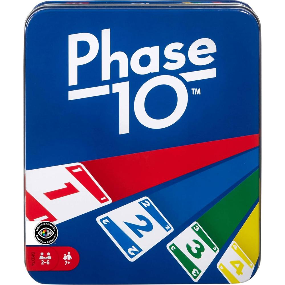 Phase 10 is the rummy-type card game from the makers of UNO game with an exciting twist — and in a convenient storage tin, it's easy to take the fun on the road The challenge is to be the first player to complete 10 varied phases that include two sets of three, one run of seven, seven cards with the same color and more. The twist is that each Phase to be completed is specific for each hand dealt. Players must complete one Phase to advance to the next or keep trying until they do. Special graphic symbols added to the cards help identify the color on that card, allowing players with any form of color blindness to play. Each deck features 'Wild' and 'Skip' cards for extra excitement. Complete all 10 phases first and win the game Includes 108 cards and instructions. Designed for 2 to 6 players ages 7 years old and up. Colors and decorations may vary.