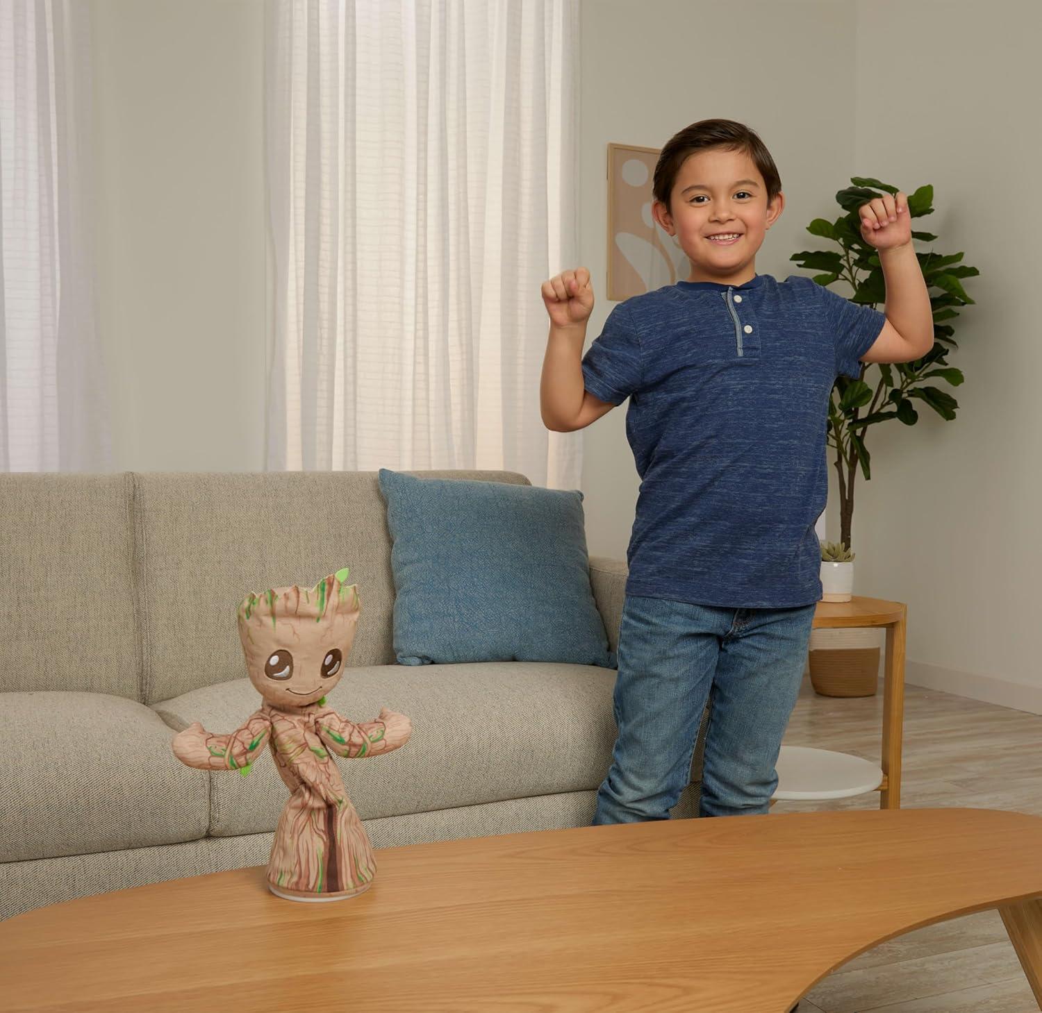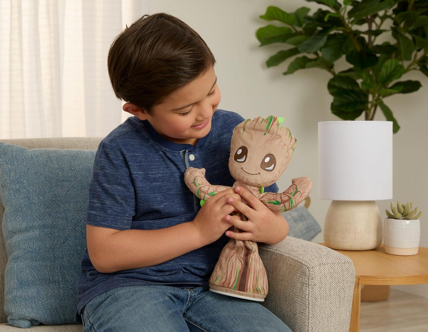 Marvel fans can dance their way through adventure with this dancing and talking Groot plush toy! Standing 13 inches tall, the Super Hero soft doll gets the party started with the push of the button between his root-like feet. Enjoy dance moves, music, sounds and English phrases inspired by the beloved character. Fans of the Guardians of the Galaxy, Marvel and a good groove will love dancing along with this plush for play or display! Colors and decorations may vary.