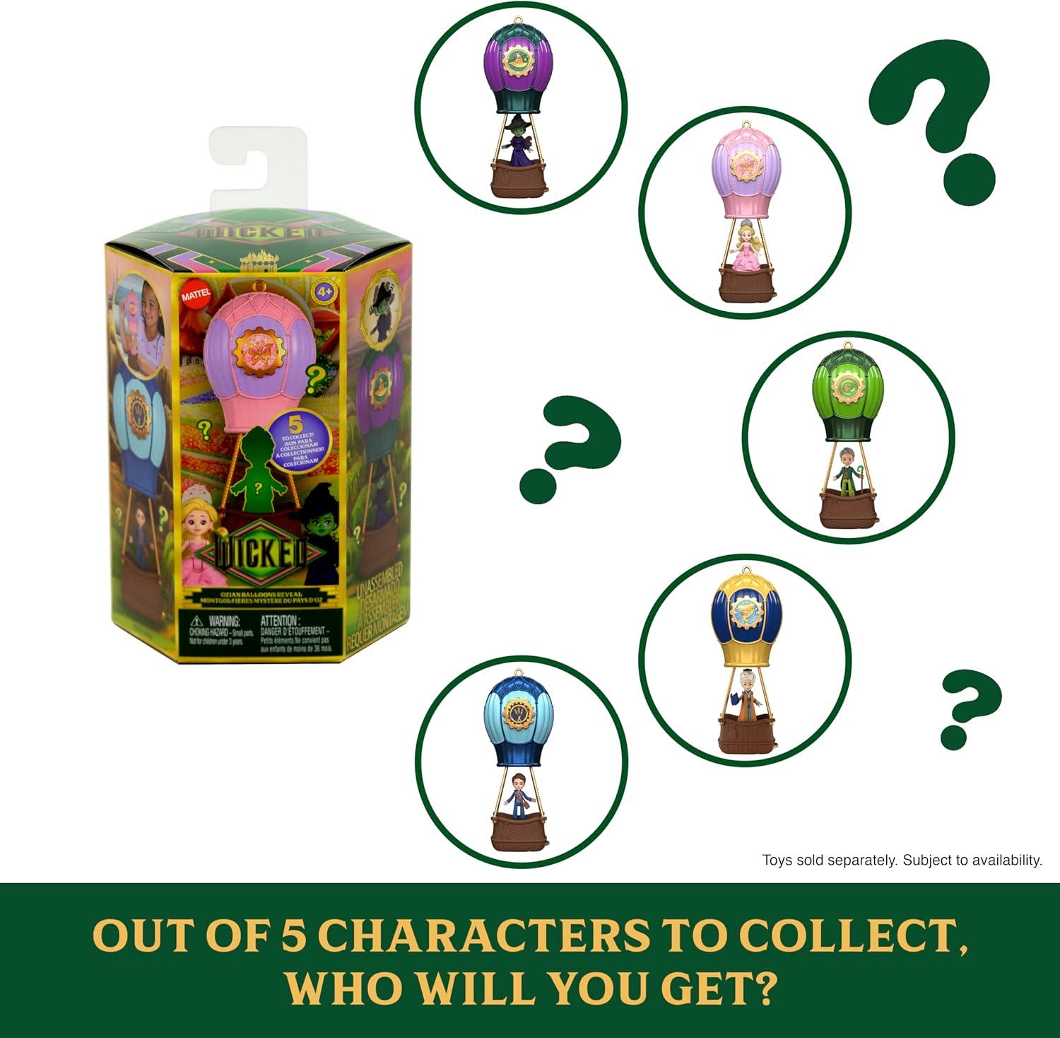Set off on an adventure through the skies of Oz with the Ozian Balloons Reveal small doll set inspired by Universal Pictures' Wicked! Discover a surprise inside each set by opening the balloon halves to uncover a character doll and accessory. Assemble the toy hot air balloon and explore! Kids can collect the 2.75-inch-tall Elphaba, Glinda, Fiyero, Madame Morrible and The Wizard, each with a different balloon color, a unique accessory and a head that bobbles. Up, up and away to Emerald City with one or all five Ozian Balloons Reveals! Each sold separately, subject to availability. Dolls cannot stand alone. Colors and decorations may vary.