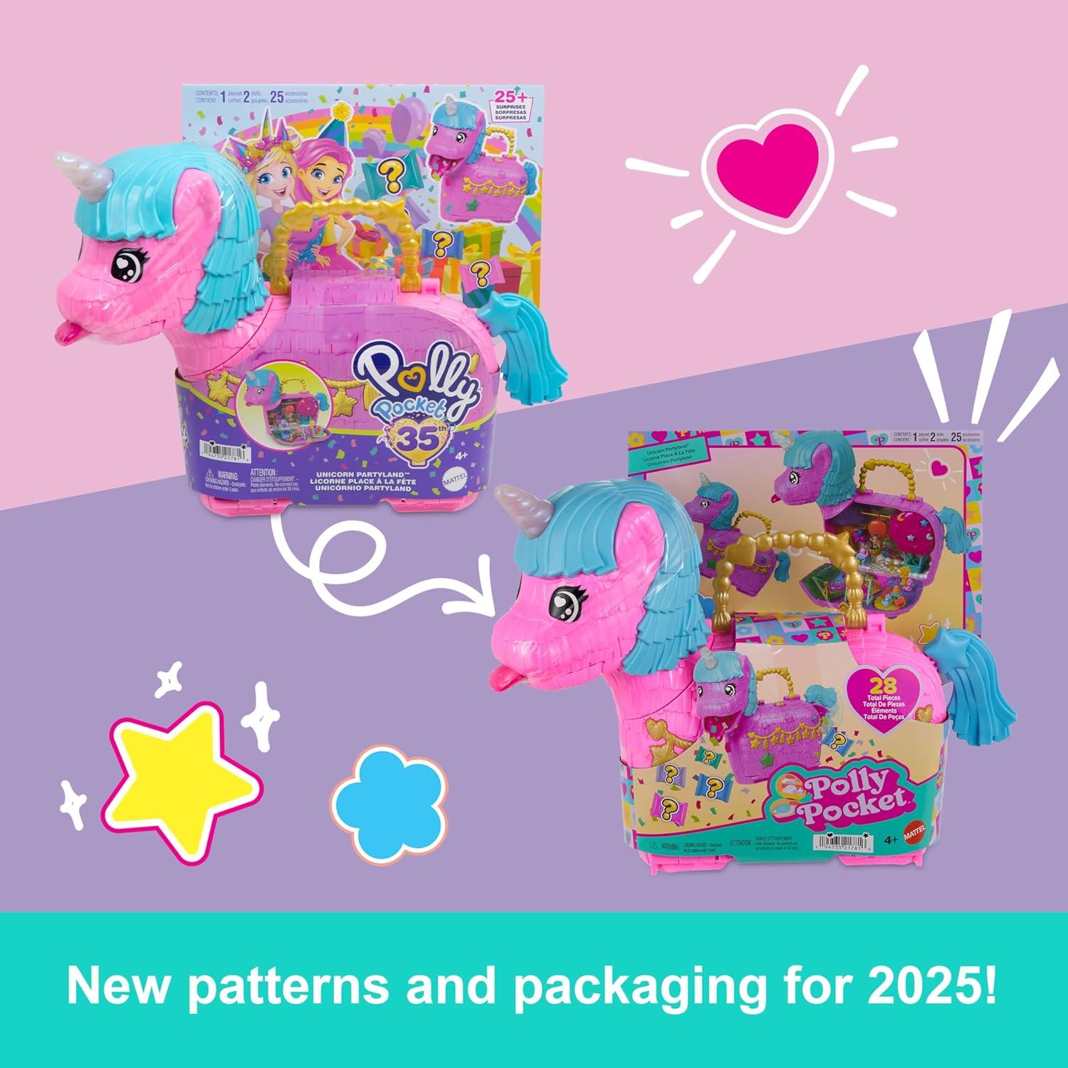 Polly Pocket Dolls & Playset with Pets & 25+ Surprise Accessories, Birthday Celebration Unicorn Partyland Playset, Hot Air Balloon Ride